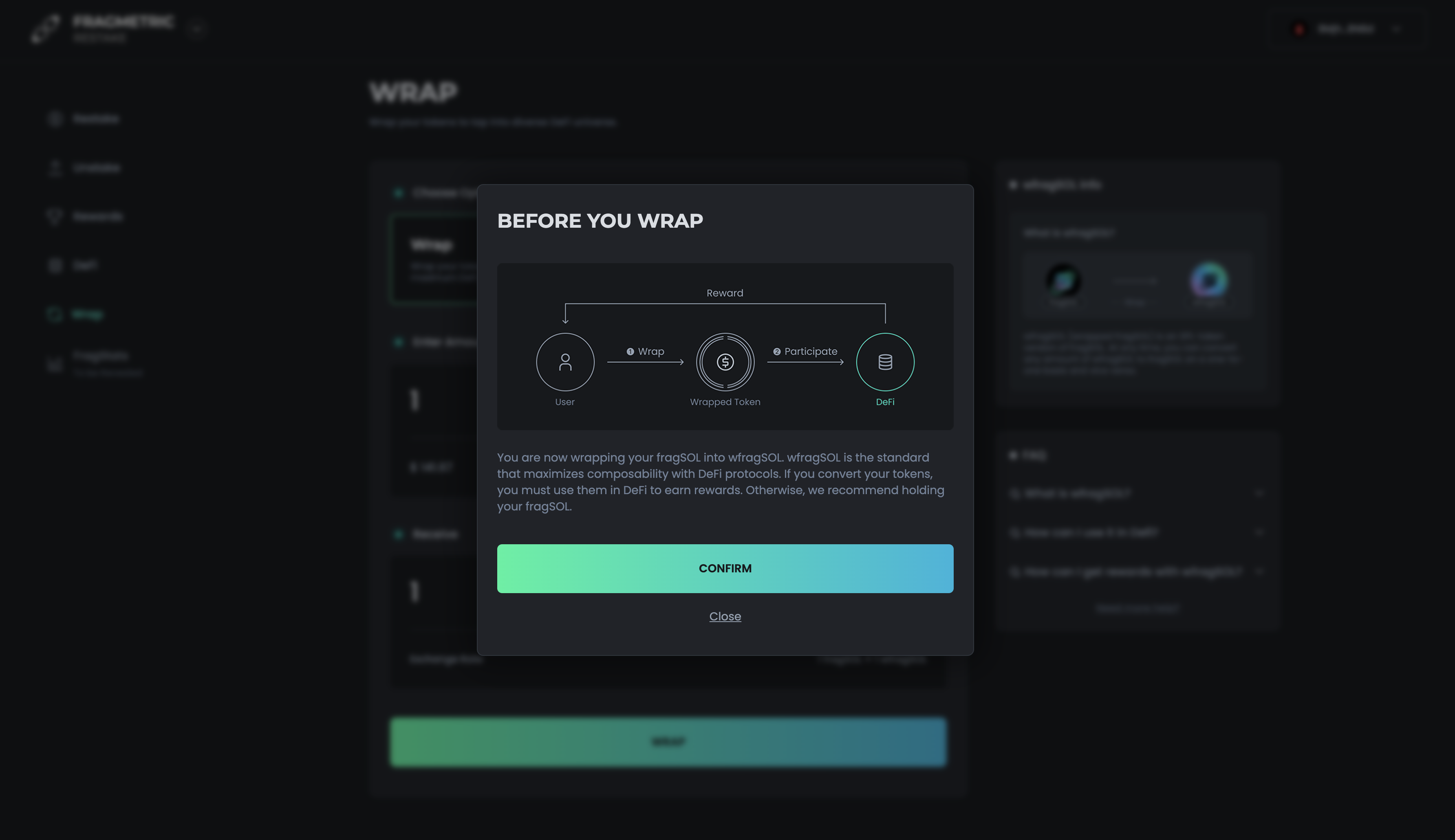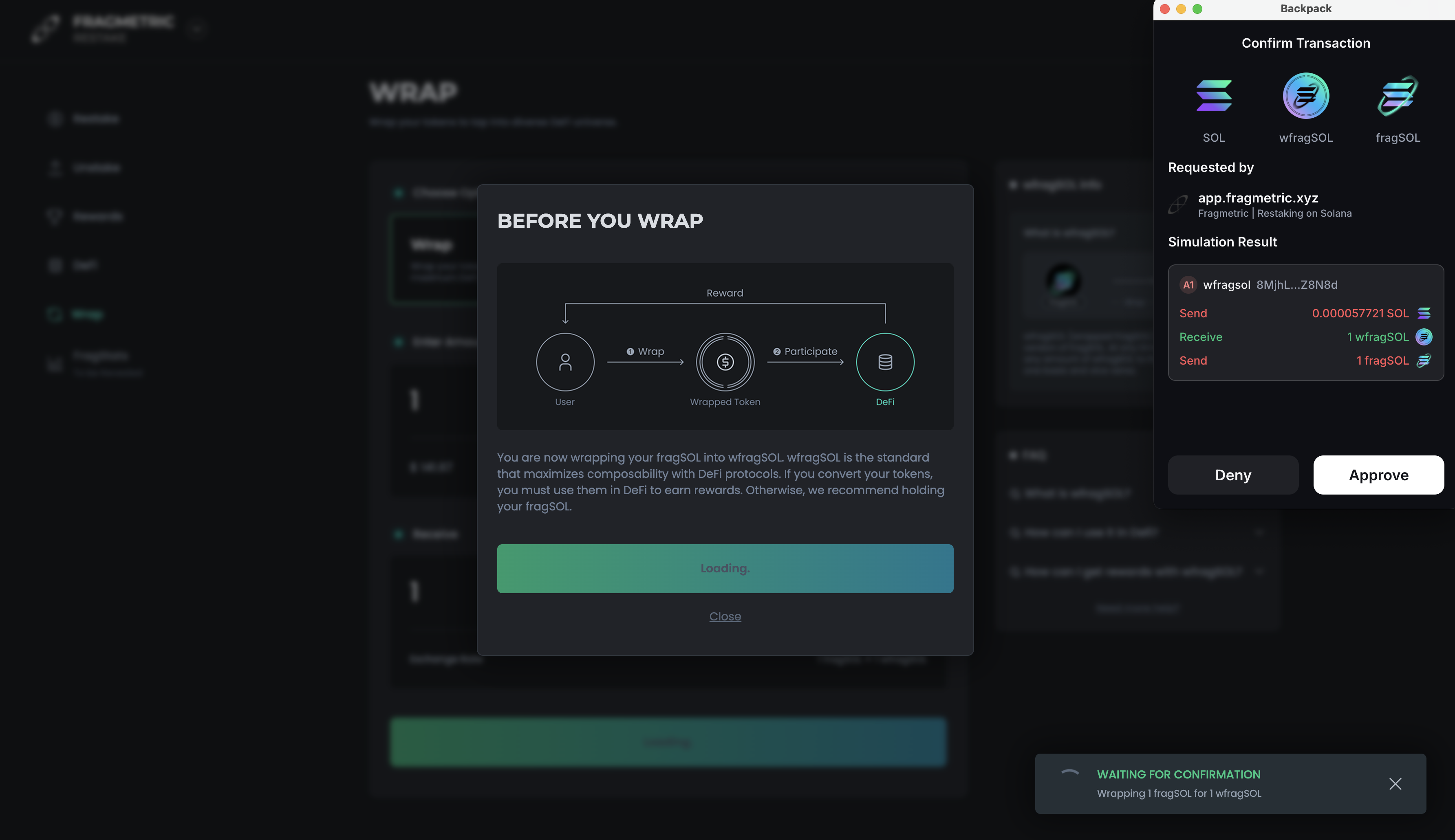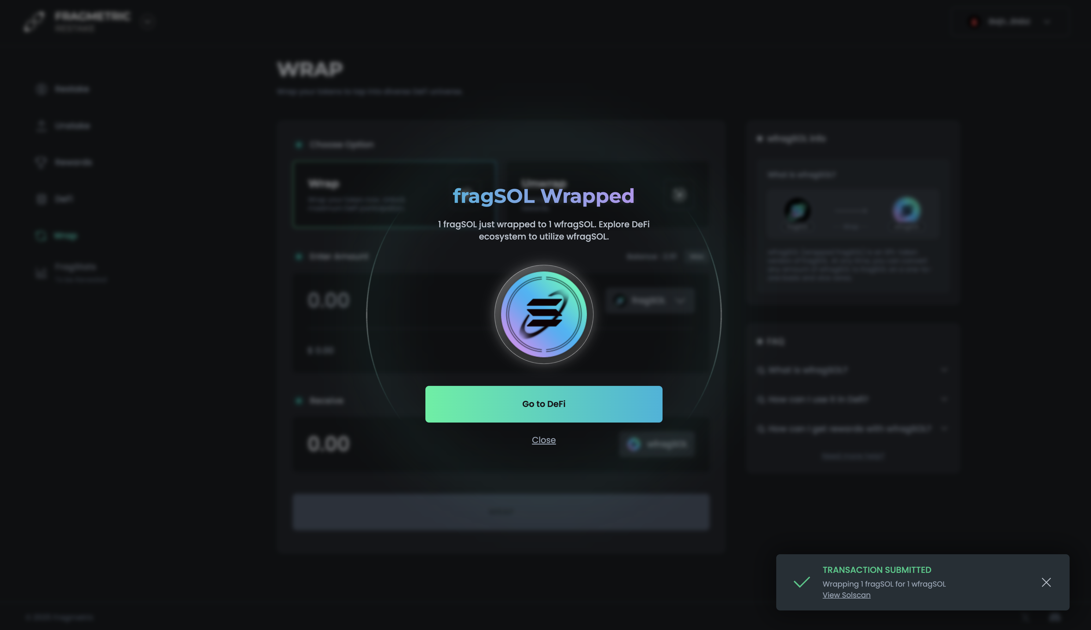 Confirm the transaction in your wallet. Once complete, wfragSOL will appear in your wallet.